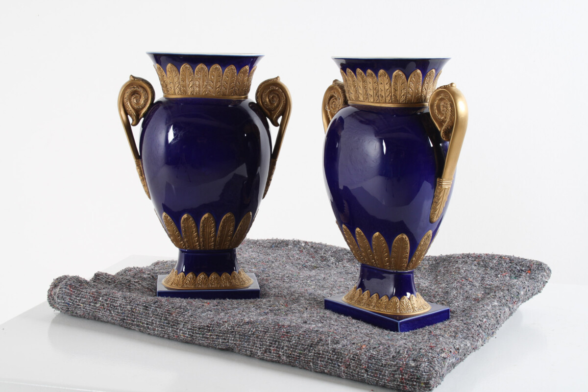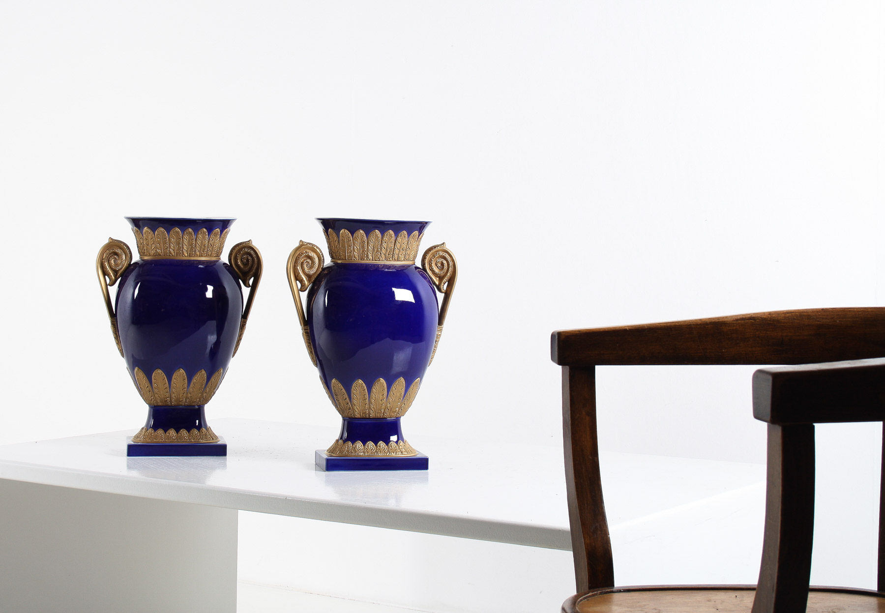 Standing tall and elegant, each vase showcases meticulous craftsmanship, reflecting the artistry of Italian ceramics. The combination of cobalt blue and gold not only creates a stunning visual contrast but also evokes a sense of nostalgia, making them perfect statement pieces for any sophisticated interior. Whether displayed on a mantel or as part of a curated collection, these vases are a timeless representation of luxury and style.