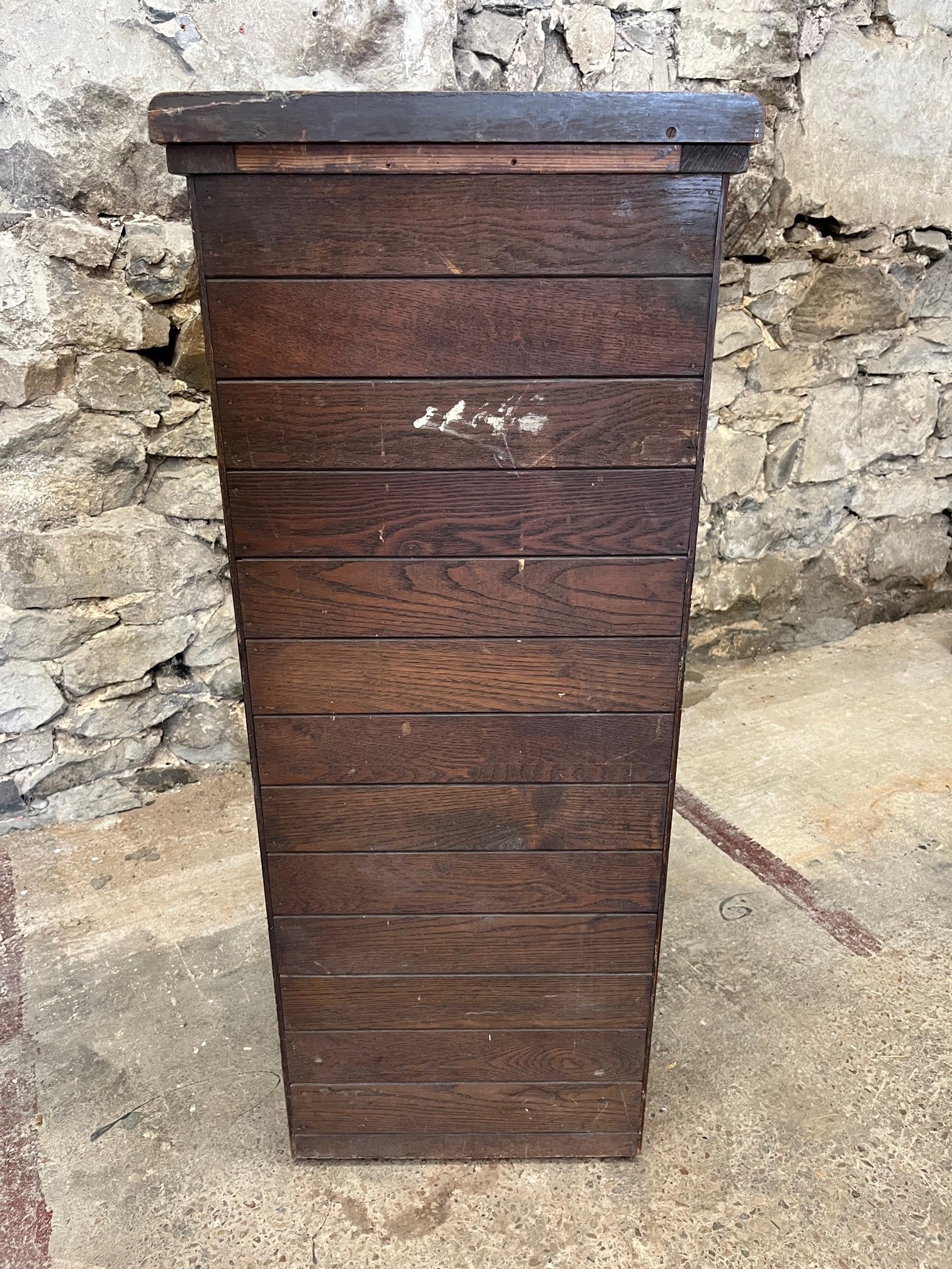 Part of our Barnfind Collection: An early 20th century front roll filing cabinet. 9 drawers that slide out which take A4 papers. Has a tilt top / lectern.