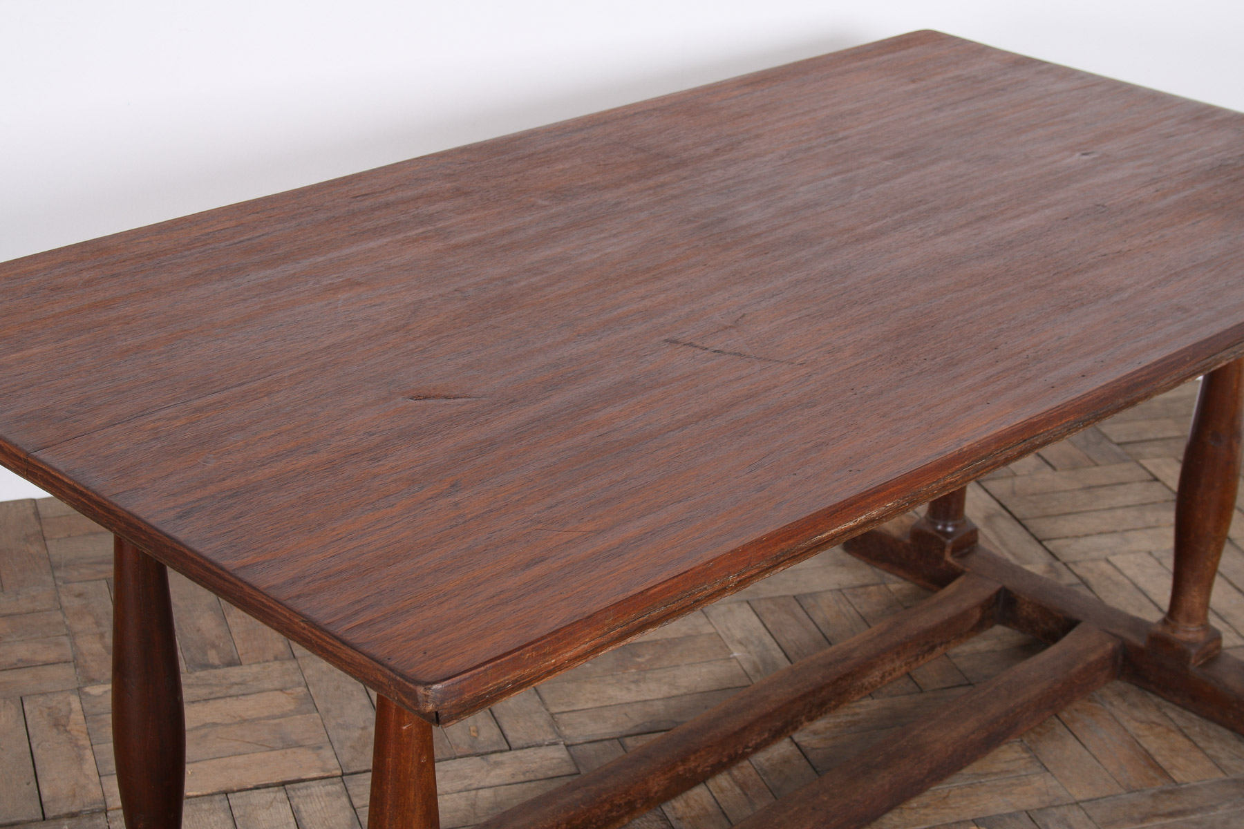 Circa 6 feet long, this table comfortably seats 6 people, making it ideal for most family areas. The elegant two-column legs feature a lovely gentle curved silhouette joined by a double stretcher, adding a touch of sophistication to the robust design. The top has a lovely smooth satin like finish with some dark grains and patina to the surface, perfect for everyday use.