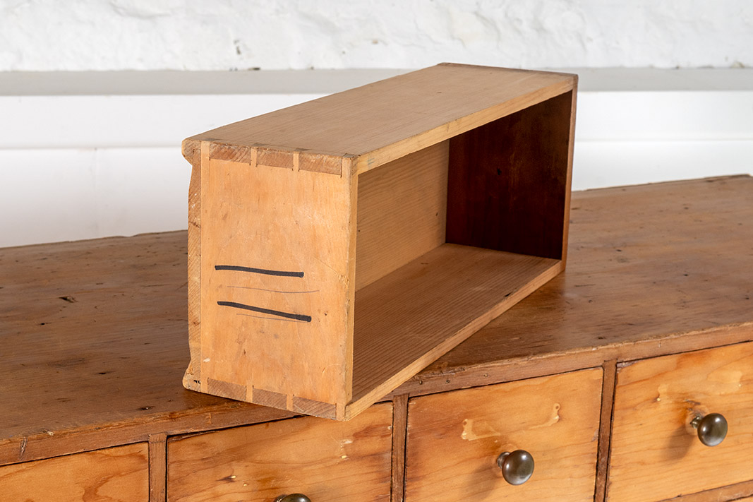 Solid pine in wonderful dry pine colour which can only be achieved with age. The carcass is made from single plank width which again points to the age of the piece, and is dovetail jointed at each corner. Drawers are also finely dovetailed. Brass handles to all the drawers, some variation in colour to the handles which points to some on these being replacements but they are all heavy solid brass so not cheap modern handles. The unit sits of four bun feet.