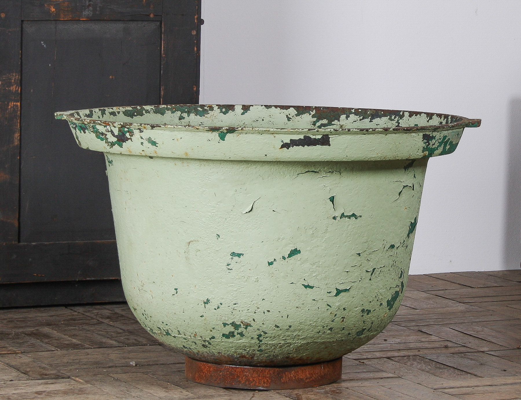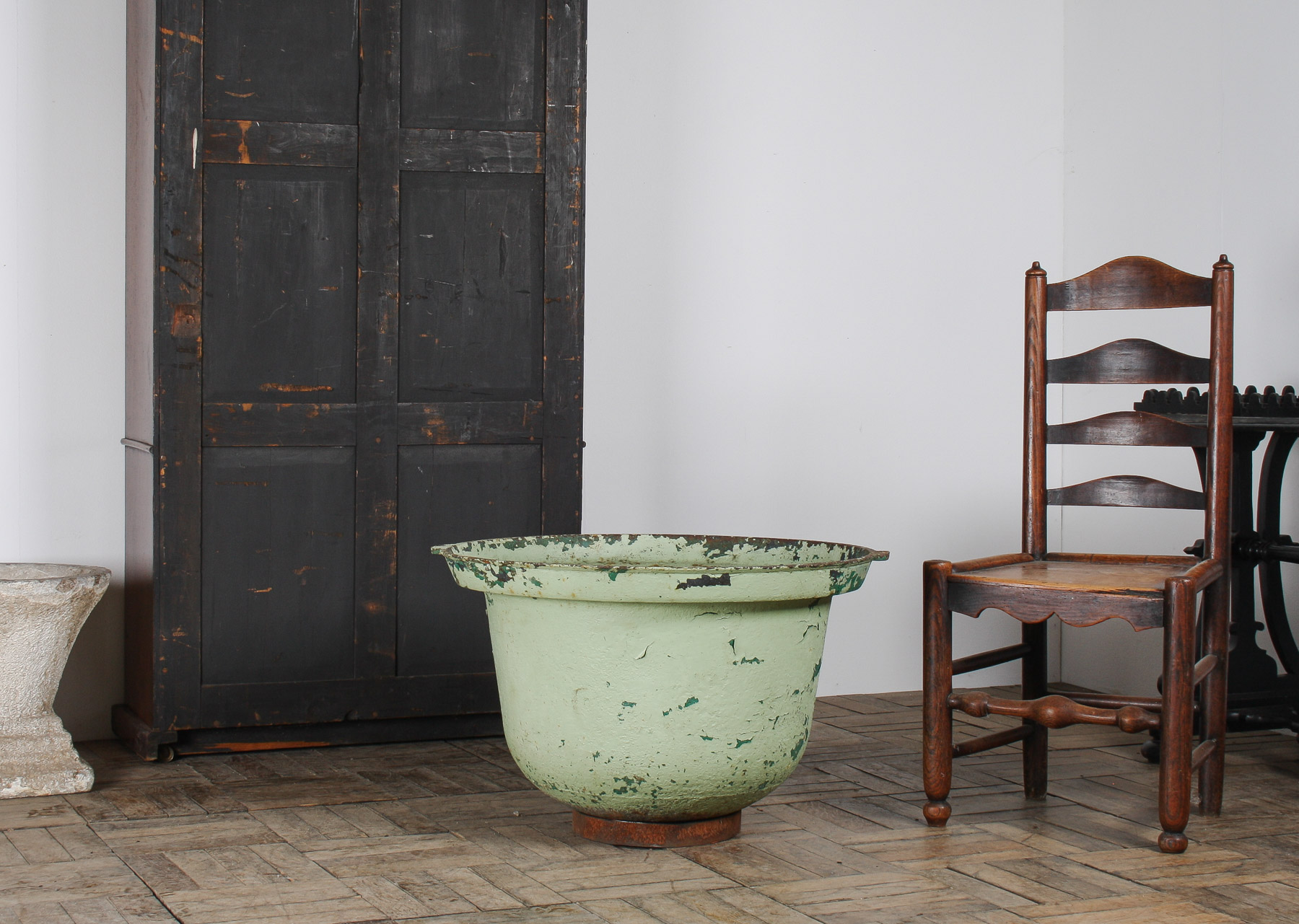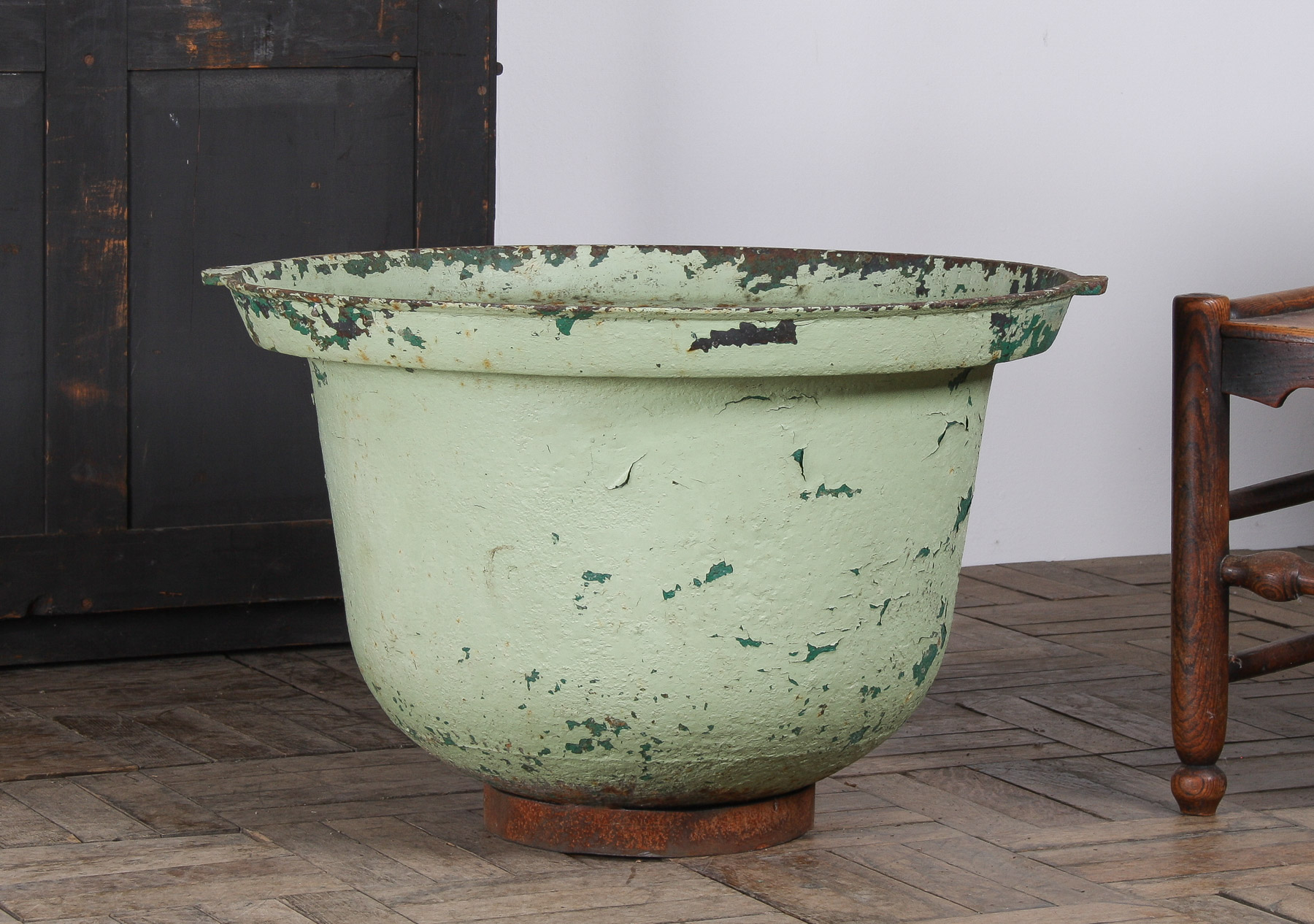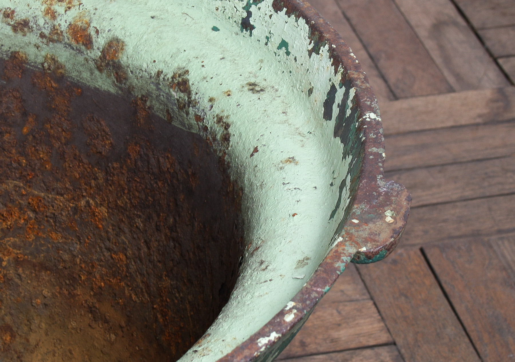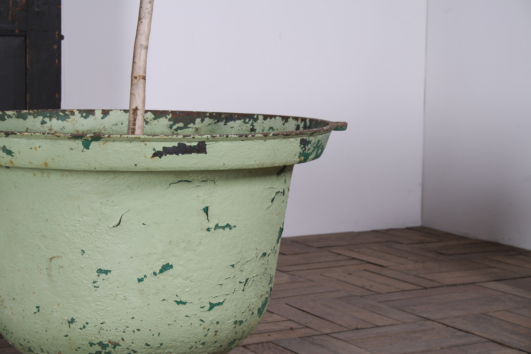The planter showcases a unique patina characterised by its rustic iron charm, featuring layers of old paint. The dark green base is beautifully complemented by flaky layers of Verdigris green, setting this cauldron apart from ordinary planters. Its deep curved silhouette gracefully steps out at the top, forming a wonderfully crafted edge that adds to its aesthetic appeal.