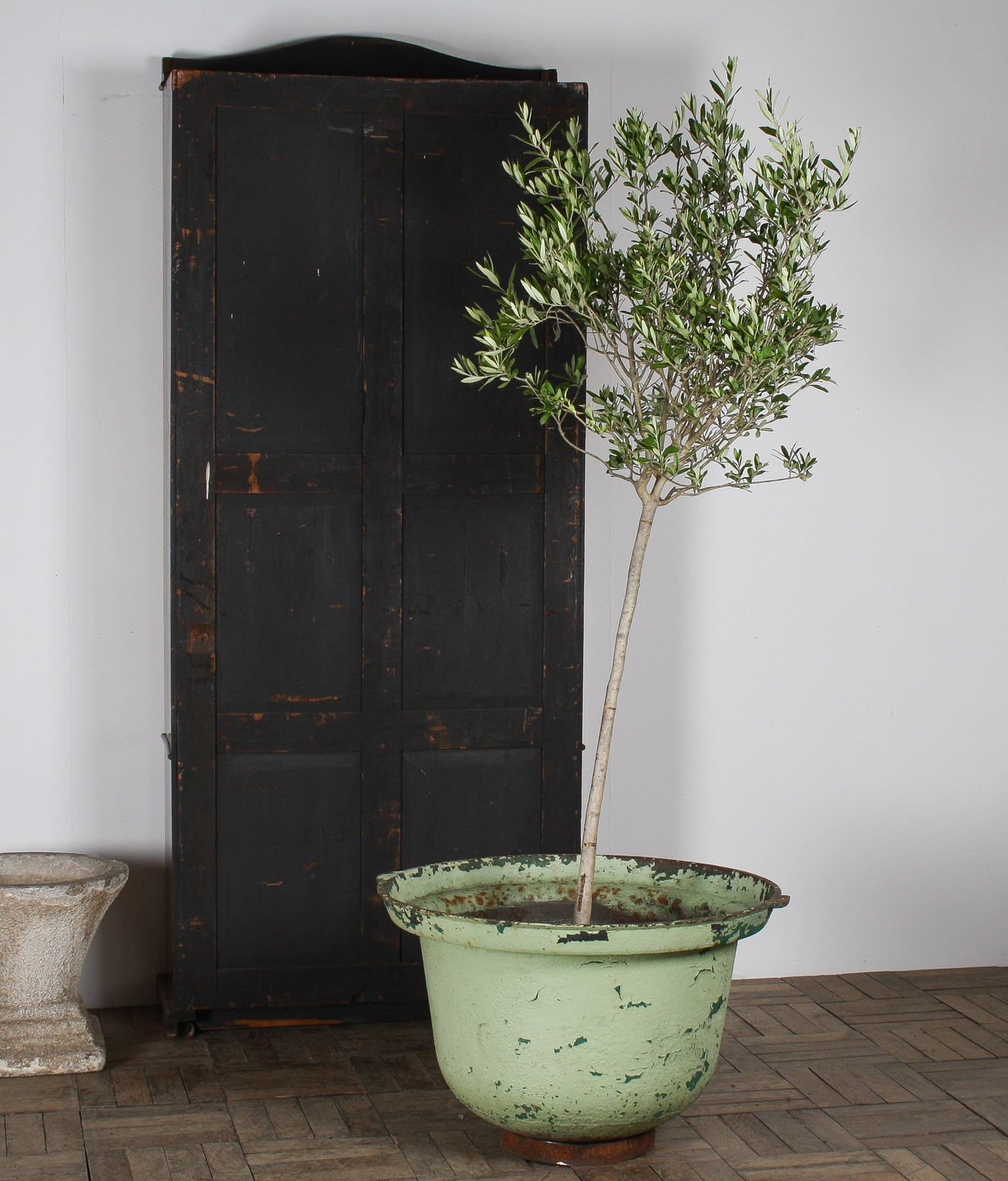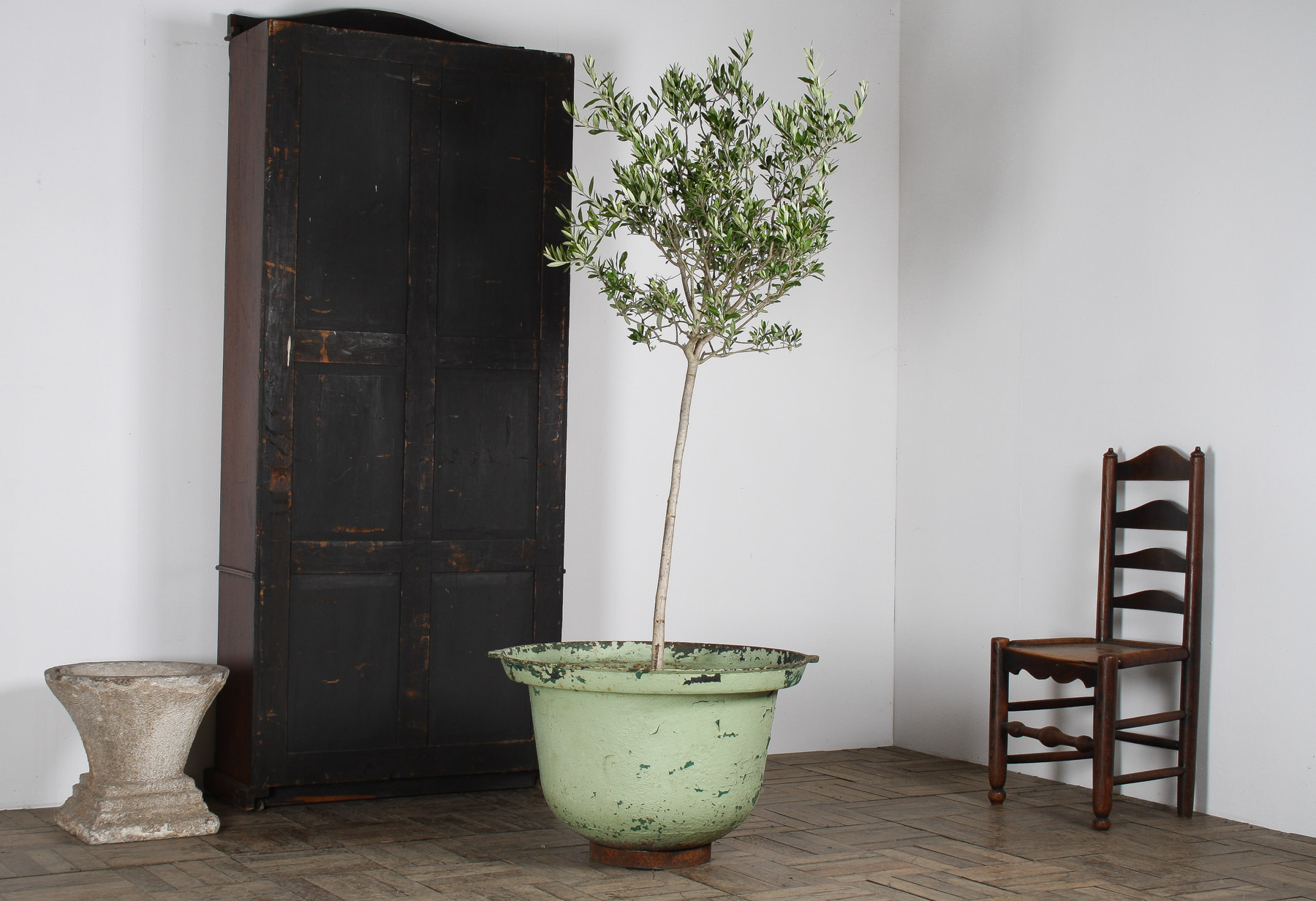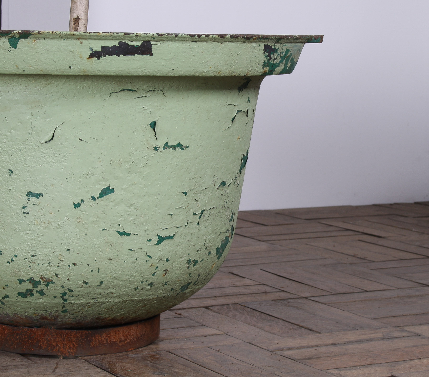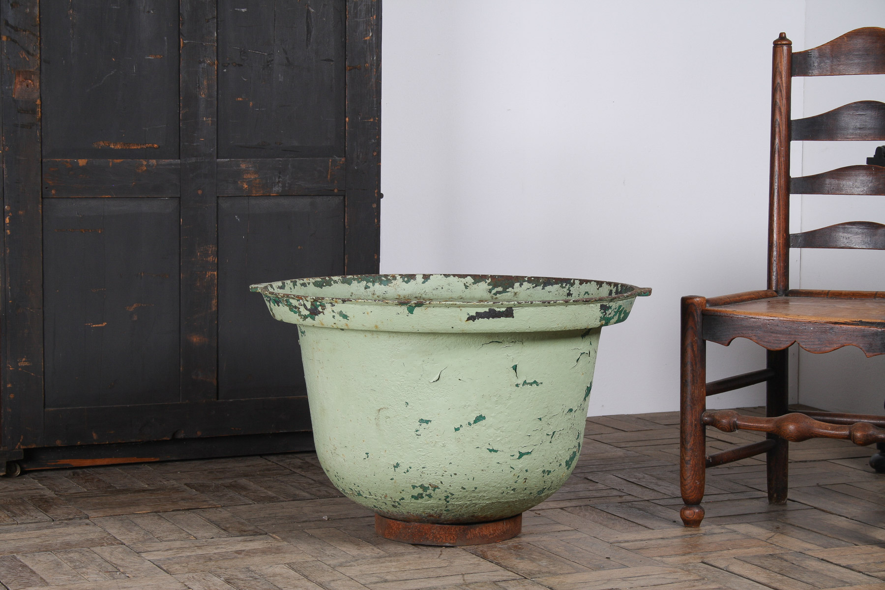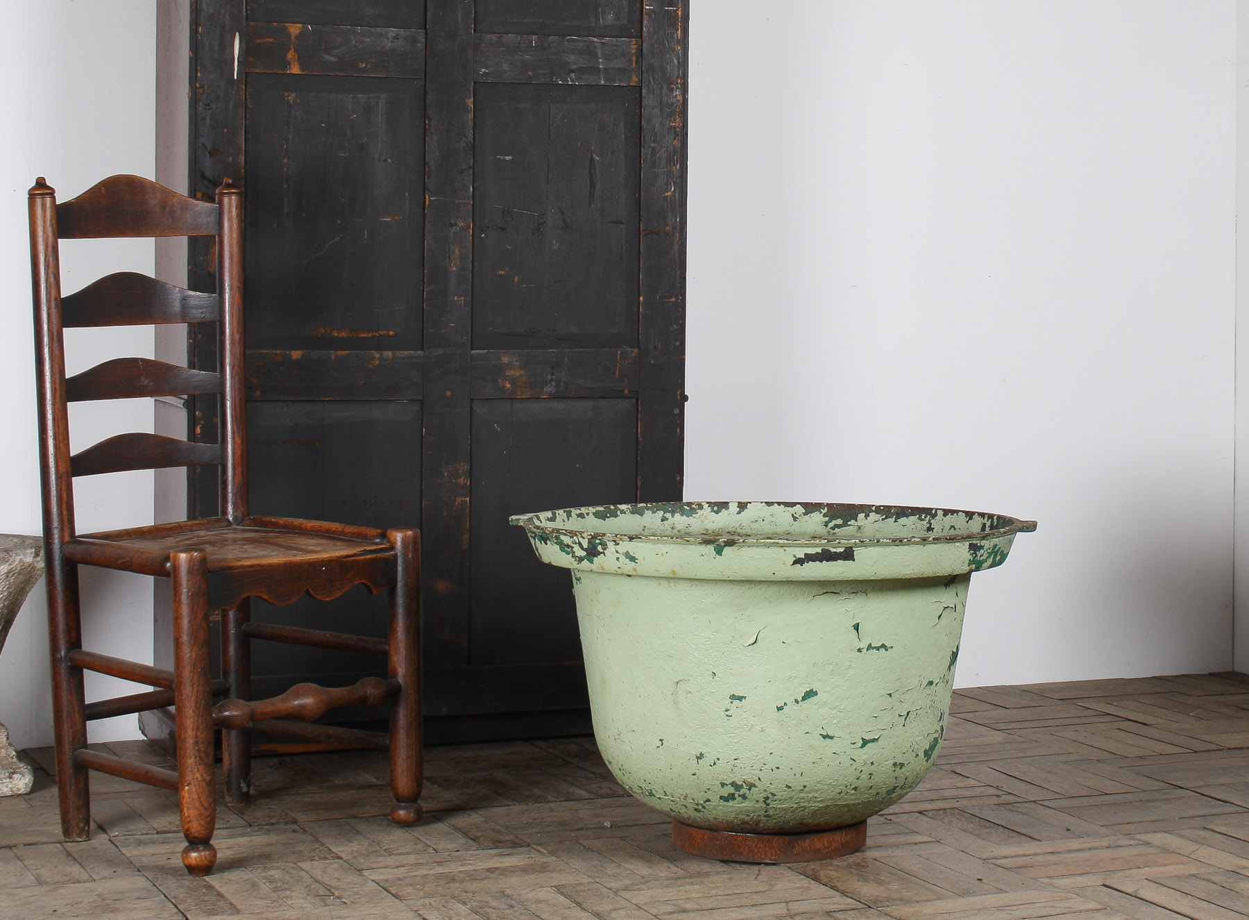 The planter showcases a unique patina characterised by its rustic iron charm, featuring layers of old paint. The dark green base is beautifully complemented by flaky layers of Verdigris green, setting this cauldron apart from ordinary planters. Its deep curved silhouette gracefully steps out at the top, forming a wonderfully crafted edge that adds to its aesthetic appeal.