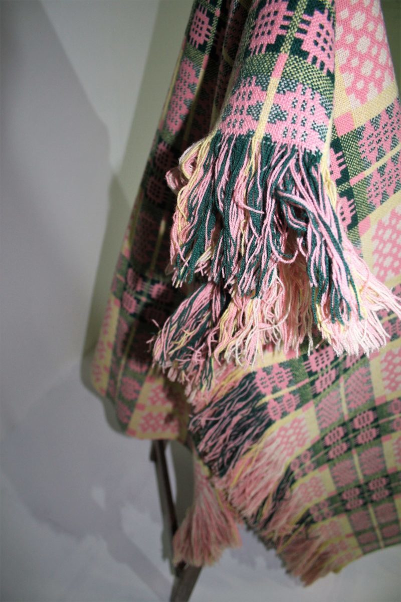 Traditional Welsh tapestry blanket in Pink with Green and Yellow tones